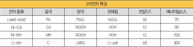 각 2차전지별 특성은 표 1과 같이 나타내 볼 수 있다. 그 중 리튬-이온 2차전지의 특성은 다음과 같다.
