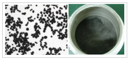 고체 분말은 10kg 이내, 전용 용기를 사용했다. 고체 분말의 크기는 일정하지 않으며 대략 1μm~100μm 정도이다. 그림 5에 전용 용기와 200배 확대된 고체 분말을 나타냈다.