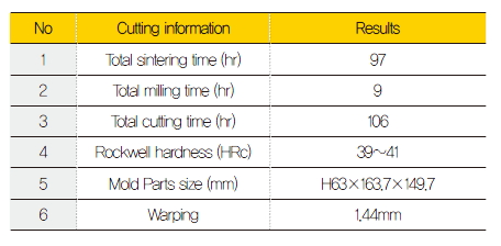 분말 재료는 레이저 소결 및 NC 가공 후 제품의 표면경도는 HRc 40 정도로 나타났다. 표 2에 제작된 캐비티 부품의 가공 결과를 나타냈다.