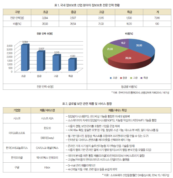 여기에는 보안 인식 애플리케이션의 설계, 보안 솔루션에 대한 동적 및 정적 테스팅, 상황 인식 및 적응적 접근 통제와 결합된 실시간 애플리케이션 자가 방어 등이 필요할 것이다[2][3]. 국내 보안 업계는 최근 들어 급속히 증가하고 있는 다양한 보안 사고에 대응할 수 있는 다양한 업종(대기업, 공공기관, 금융기관 등)에서 보안 인력 수요가 빠르게 증가하고 있다.
