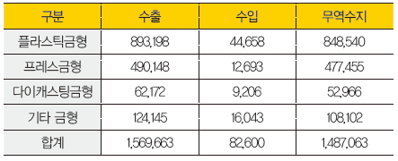 한국금형공업협동조합에 의하면, 우리나라 2015년 상반기 금형 수출은 15억6,966만 달러, 수입은 8,260만 달러로 무역수지 흑자 14억8,706만 달러를 기록한 것으로 나타났다.
