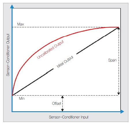 그림 2에 비보정 센서 신호 컨디셔너와 보정된 센서 컨디셔너의 기대 출력을 감지소자 입력 신호면에 나타냈다. 보정하지 않은 출력에는 감지소자와 신호 컨디셔너의 아날로그 회로가 신호 흐름 상에서의 비 이상성이 모두 포함되어 있다는 점에 주목한다.