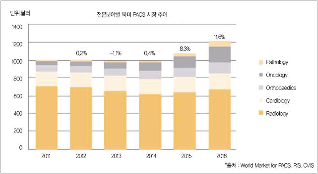 ▲ 2011년~2016년 기간 중 전문분야별 북미 PACS시장의 변화 전망
