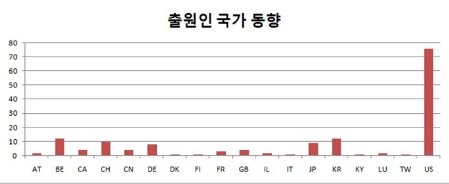 국가별 특허출원에서 미국(US)이 압도적으로 1위를 차지하고 있으며, 한국과 벨기에(BE), 일본(JP)이 그 뒤를 잇고 있다. 출원인의 국적별 출원건수에서 미국인이 압도적으로 많은 것은 미국이 관련기술개발을 주도하고 있다고 판단된다.
