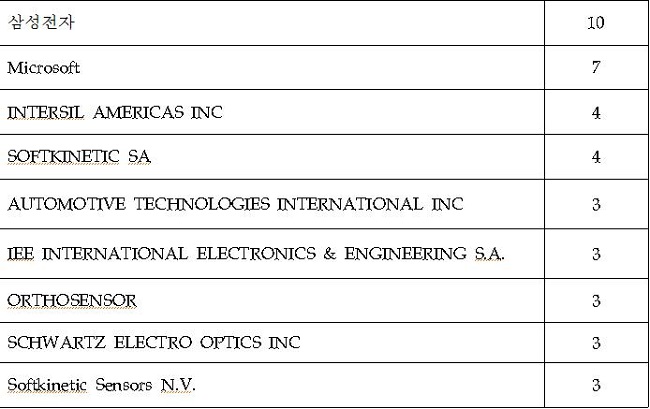 전 세계적으로 TOF 특허를 3건 이상 출원한 회사들을 살펴보면 다음의 <표 1>과 같이 조사된다. <표 1>에서 삼성전자가 가장 많은 특허 출원을 하고 있다. 그리고 Software를 주업무로 하는 Microsoft 미래를 대비하여 삼성전자 다음으로 많은 특허 출원을 하고 있음을 알 수 있다.