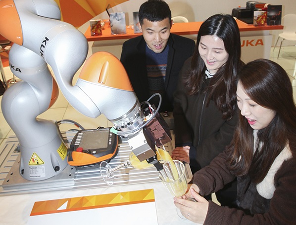현실세계와 디지털세계를 융합하는 지능형 자동화 로봇 LBR iiwa는 이번 전시의 주제이자 독일 제조업의 성장전략인 ‘인더스트리 4.0’의 일환으로 개발된 제품이다.