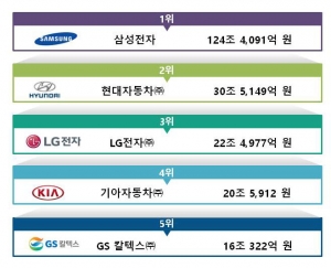 산업정책연구원(IPS)은 ‘기업 브랜드 가치평가’ 연구 결과를 공개했다. 2000년 이후 매년 발표하고 있는 기업브랜드 가치평가 결과에서는 삼성전자가 약 124조로 국내 최고의 브랜드 가치를 지닌 기업으로 선정됐다. 이와 함께 현대자동차와 LG전자가 각각 30조원과 22조원으로 평가돼 지난해와 순위 변동 없이 2위, 3위를 차지했다. 또한 기아자동차가 20조로 4위, GS칼텍스가 16조로 5위였다.