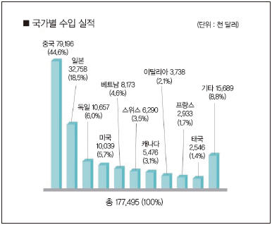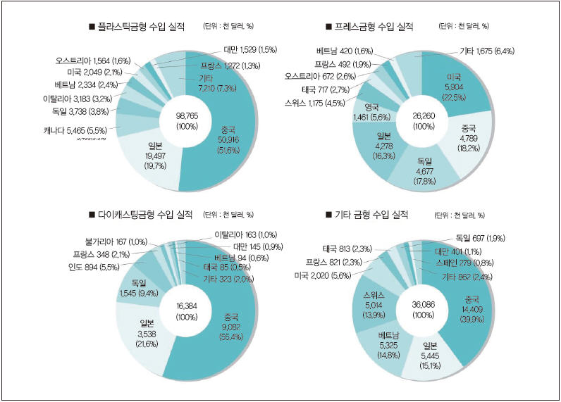 국가별로는 중국 7,919만 달러와 일본 3,275만 달러로 국내 수입량의 63.1%를 차지했으며, 독일 1,065만 달러, 미국 1,003만 달러가 그 뒤를 이었다. 또한 이전까지 금형 수입량이 미미했던 캐나다와 이탈리아에서 각각 547만 달러, 373만 달러를 수입한 것으로 나타났다.
