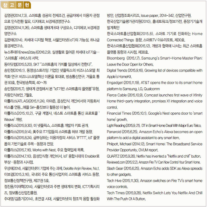 스마트홈 생태계를 선점하려는 개방참여형 플랫폼으로 구글과 애플을, 기술요소형 플랫폼을 유지하면서 동시에 개방참여형을 선언한 삼성전자, LG전자, 그리고 여전히 채널통제형을 유지 중인 AT&T, 프랑스텔레콤 오렌지 등의 통신기업 간 플랫폼 경쟁 구도가 예상되는 가운데, 올해의 CES(국제소비자가전박람회; Consumer Electronics Show) 2016 주요 테마도 스마트홈이며, 이의 기반 기술은 단연 사물인터넷(Internet of Things; 이후 IoT)이다.