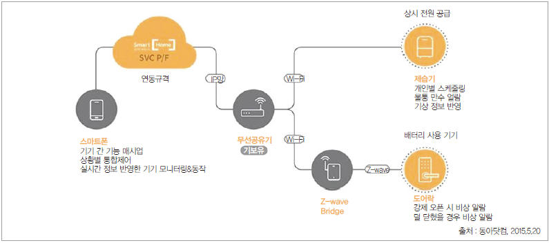 2015년 5월 20일, SK텔레콤은 간담회를 통해 자체 개발한 개방형 스마트홈 플랫폼을 기반으로 서비스를 상용화하면서 IoT 시장에 본격적으로 진입한다고 밝혔으며, 스마트홈 브랜드인 ‘Smart Home by SK Telecom’를 발표하고, 관련 협력사와 함께 개발한 스마트홈 기기를 선보였다. <그림 3>은 SK텔레콤이 제공하는 스마트홈 서비스 개념도이다.