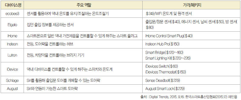 2014년 개최된 WWDC에서는 필립스, 하이얼, 하니웰 등이 홈킷 제휴사로 발표됐지만 이들 제품들이 출시되지는 않은 상황이며, 초기 홈킷 인증을 받은 제3자 제품들로는 온도조절기인 에코비3(Ecobee3), 출입정보 센서인 엘가토(Elgato), 스마트플러그인 아이홈(iHome), 도어락 제어 허브인 인스테온(Insteon), 전등 제어 브릿지 기기인 루트론(Lutron), 댁내 기기 제어 스위치인 아이디바이스(iDevice), 시리를 활용해 출입문 도어를 개폐하게 하는 도어락인 쉴라게(Schlage), 스마트도어락인 어거스트(August) 등이 있다(한국스마트홈산업협회, 2015.12). 2015년 9월 현재 시점에서 홈킷 호환 제품은 다수 등장했지만, MFi 인증까지 받은 제품은 단순 호환 제품보다 셋업과 이용 측면에서 훨씬 앞서 있으며, MFi 인증을 받은 홈킷 지원 제품 라인업은 <표 2>와 같다.