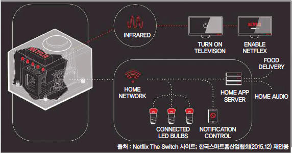 넷플릭스는 스마트TV를 댁내 로컬 네트워크를 통해 서버와 접속시키고, 음식 주문과 프로그램 일시정지, 전등 밝기 조절 등이 가능하게 함으로써(Tech Time, 2015. 9.28) 홈엔터테인먼트 영역에서 홈오토메이션 관련 스마트홈 서비스 영역으로 확장할 여지를 보여준 것이다. 또한 넷플릭스는 스마트TV 및 셋톱박스 제조업체들과 협력해 스마트홈까지 포함된 넷플릭스 전용 버튼을 리모컨에 탑재할 수 있게 된 것이다(아틀라스, 2015.9.30). <그림 4>는 넷플릭스가 제공하기 시작한 더스위치를 활용한 서비스 개념도이다.
