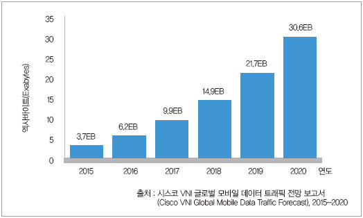 2020년 세계 월별 모바일 데이터 트래픽은 30.6엑사바이트를 기록하며, 2015년 3.7엑사바이트 대비 약 10배 증가할 전망이다. 한국의 경우에는 2015년 131페타바이트에서 2020년 649.7페타바이트로 5배 정도 증가할 전망인데, 이는 1억 6,200장의 DVD와 맞먹는 분량이다.