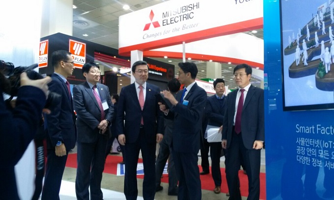 ▲ 중소기업청 주영섭 청장이 9일 오토메이션 월드 전시장을 찾아 중기 대상 스마트 공장 구축 사업을 점검하고 있다.