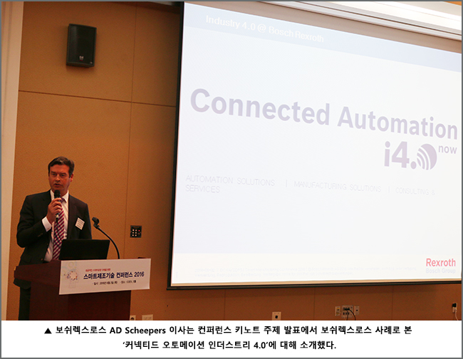 먼저, 이번 행사의 키노트 주제 발표에서 배경한 민관합동 스마트공장 추진단 부단장은 ‘스마트공장 추진 정책과 성과’에 대해 소개했으며, 김은 한국ICT융합네트워크 부회장은 ‘인더스트리4.0 비전과 현황’, 이태진 액센추어 전무는 ‘제조기업들이 산업용 인터넷을 활용하는 최선의 방법’, 아드 쉬퍼스(AD Scheepers) 보쉬렉스로스 이사는 보쉬렉스로스 사례로 본 ‘커넥티드 오토메이션 인더스트리 4.0’을 강연해 많은 주목을 받았다.
