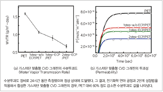 또한 그래핀 필름의 합성 단계를 2단계로 나눈 2단계 성장법을 통해 그래핀의 결점을 제어하고 가스 차단 특성을 향상시켰다. 이러한 가스 차단 맞춤형 CVD 그래핀을 PET 기판에 전사해 수분투과도를 측정한 결과, 그래핀 1장으로도 수분투과도가 PET 기판 대비 60% 정도 감소했다.