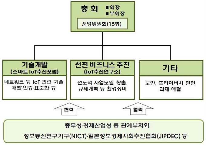 이는 IoT 기술개발 워킹그룹으로서 ▴스마트 IoT추진포럼 ▴IoT추진연구소 등으로 구성돼 IoT 프로젝트 발굴·선정, 규제 개혁, 기업 간 제휴·자금 등을 전폭적으로 지원하는 인프라 정비를 실시하는 것이 핵심 업무다.