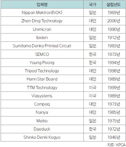 KPCA에 따르면, 2015년 세계 30대 전자회로기판 기업에 한국 기업은 셈코, 영풍, 대덕, LG이노텍, 심텍 등 총 5개가 포함됐다.