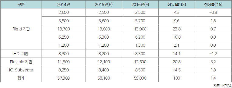 세계 제품별 기판 생산은 Rigid 기판이 50.6%, Flexible 기판 20.8%, HDI 기판 14.1%, IC-Substrate 14.5%를 차지했다. Rigid 기판 중에는 4층~6층 기판이 전체의 23.8%를 차지했다. 모바일기기용 기판의 성장세 둔화에 따라 가격경쟁력 요구가 더욱 거세지고 있으며, 적용 기판인 빌드업 기판, 반도체 PKG 기판, FPC 생산은 2016년부터는 3% 전후의 성장을 이어갈 것으로 전망됐다.