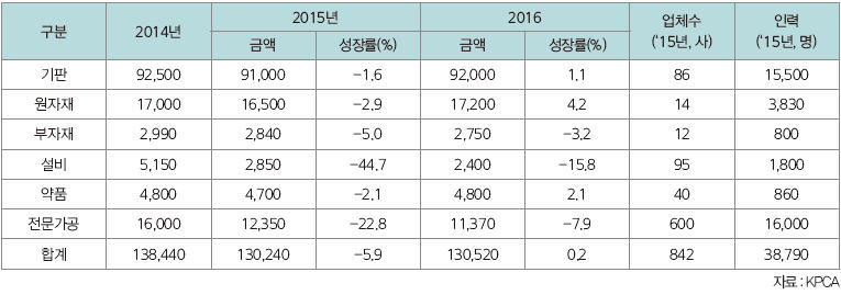 전자회로기판의 국내 수요가 감소세로 접어들면서 일부 국내 설비업체는 기술력을 바탕으로 중화권 및 동남아시아로 진출함으로서 점차 글로벌 경쟁력을 강화시키고 있다. 보고서는 2016년에 기판 업체의 신규 투자는 최소화할 것으로 보이나 반도체 PKG 분야와 합리화 부문에서의 투자는 지속될 것으로 예상했다. 보고서는 국내 기판 원자재 시장을 Rigid CCL 시장, Flexible CCL 및 동박 시장으로 구분했다. 2015년도의 전체적인 원자재 시장 규모는 Rigid 기판용 7,100억 원, Flexible 기판용 5,700억 원, 동박 3,700억 원으로 전년보다 1.3% 하락한 1조 6,500억 원을 기록했다.