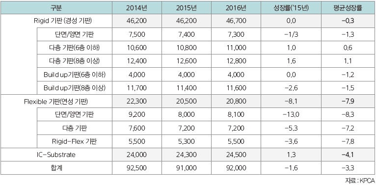 2015년 국내 전자회로기판 생산량은 전년 대비 0.4% 감소한 33,650천m2였으며, 2016년은 1.9% 성장한 3,300m2으로 전망됐다. 연성 기판은 스마트 디바이스 감소로 8.2% 줄었고, 단위 면적당 고부가 기판인 반도체 기판은 2,550천m2로 2.0% 전년도와 동일한 실적을 나타냈다. 2016년은 SET업체의 신규 모델에 채용되는 고기능 반도체PKG 기판인 부품내장 기판, AP용 FC-CSP, 무선용 전층IVH 등 고기능 기판 중심으로 생산을 확대하며, 1.9% 성장한 34,300천m2를 기록할 것으로 전망됐다(표 3).