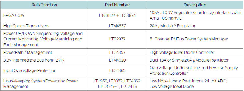 표 1은 그림 1에서 보는 Arria 10 개발 키트의 전원 레일과 기능들을 요약하고 있다. 리니어 테크놀로지 제품과 각각의 기능에 대해서 설명하고 있다.