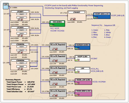 그렇다면 자신이 필요로 하는 디자인이 개발 키트에서 보여주고 있는 것과 다르다면 어떻게 할 것인가? 이러한 경우에는 LTpowerPlanner라고 하는 PC 기반 설계 툴을 사용해서 시스템의 전원 트리를 맞춤화하고 최적화할 수 있다. 개발 키트의 제안들을 출발점으로 삼되, 편리하게 전원 블록을 재구성하고, 전력 정격을 수정하고, 효율과 전력 손실을 계산하고, 각각의 전원 블록을 시뮬레이트하고, DC/DC 레귤레이터 부품 번호를 선택하고, 맞춤화된 솔루션을 달성할 수 있다.
