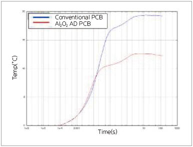 둘째, 낮은 열저항으로 소자 동작 온도를 낮춘다. Metal PCB에 적용시 기존 Metal PCB에 비해 소자의 동작 온도를 낮출 수 있기 때문에 LED 및 고출력 소자용 기판에 적용이 가능하다.