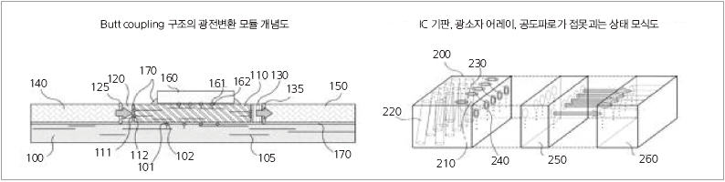 이러한 문제를 해결하기 위해 KETI는 전기-광배선 PCB 기술을 개발했다. PCB 내 광인터커넥션을 위한 새로운 구조물의 전기-광패키지로, 반도체 칩이 실장된 IC 기판의 측면에 광소자 어레이를 접합하고, 광소자 어레이의 타측에 광도파로 어레이를 광 접속되도록 접합시켰다.