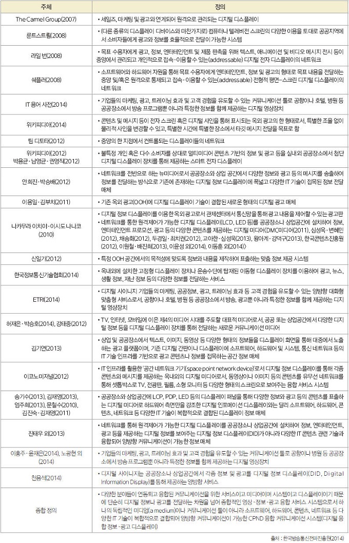 ▲표 1. 2007~2014년 디지털 사이니지 개념 정의들
