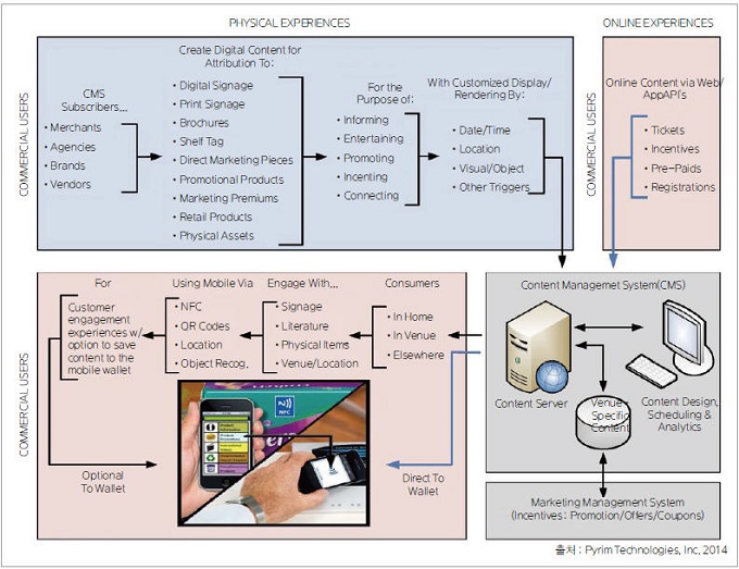 특히, 모바일 커머스에서 강조되는 영역은 콘텐츠 관리 부문이다. 앞서 LG전자가 개발한 양방향 메뉴를 솔루션으로 제공하려면 그동안 쌓인 거래 콘텐츠와 개인 행동 데이터 등의 분석을 통한 메뉴 패턴을 이해하는 과정이 요구된다. 즉, 다양한 개인 맞춤형 서비스 제공이 요구된다. 기존에 디지털 사이니지 시스템의 7요소와 모바일 커머스 시스템 구성 요소를 나타내는 구성도를 비교하면 각각 <그림 3, 4>와 같다.