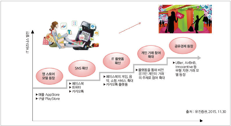 여기에 디바이스나 네트워크 부문에서는 포스트 스마트폰 시대가 시작되면서 기술적 타개책으로 웨어러블, IoT, 클라우드 컴퓨팅이 발전하게 되고, 특히 인터넷 시장은 빅데이터 분석을 기반으로 하는 모바일 마케팅 및 커머스에 관심을 갖기 시작했으며, 오프라인 기업들의 모바일 마케팅이 본격화되고 있다. 이러한 발전 과정을 그림으로 표현하면 <그림 1>과 같다.