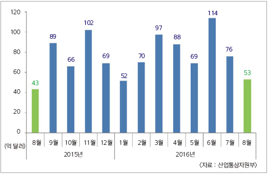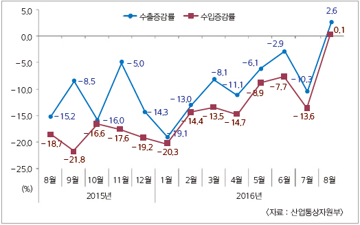 올해 8월 수출은 전년 동기대비 2.6% 증가한 401억 달러로 20개월 만에, 수입은 0.1% 증가한 348억 달러로 23개월 만에 전년 동기대비 증가세로 전환됐다. 또한 무역수지는 53억 달러 흑자를 기록해 55개월 연속 흑자를 기록했다.