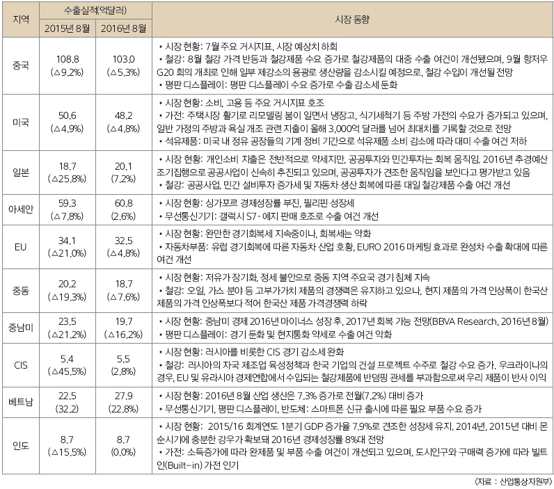 8월이 주요 업체 하계휴가에 따른 계절적 비수기임에도 불구하고 반도체, 평판 디스플레이, 석유화학 분야에서는 올해(1월∼8월 중) 최대 수출 실적을 기록했으며, 8개 주력 품목 수출이 증가하는 등 우리 수출 품목이 세계 시장에서 선전하는 모습을 보였다. 그 이유는 유망소비재 수출 증가세 지속으로 수출 저변이 확대된 것을 꼽을 수 있다.