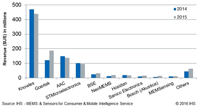 2015년도 글로벌 패키지 MEMS 마이크로폰 시장은 놀스(Knowles)의 독주 체제 속에 고어텍(Goerteck), AAC 테크놀로지, ST마이크로일렉트로니스가 그 뒤를 쫓고 있는 것으로 나타났다.