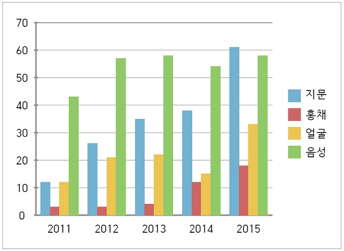 특허청에 따르면, 최근 5년간 모바일 생체인식기술과 관련된 출원을 조사해 본 결과, 2011년 76건에서 2015년 178건으로 출원량이 대폭 증가한 것으로 나타났다.