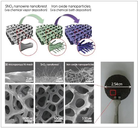 나노숲 구조를 구현(아래쪽의 왼쪽에서 두 번째)하고, 용액 공정 기반의 산화철 나노 입자를