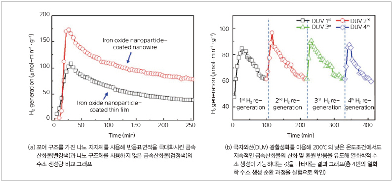 ▲ 그림 2. 나노구조 지지체를 이용한 지속적인 열화학 수소 생성 결과