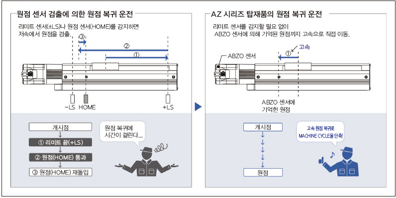 AZ 시리즈는 앱솔루트 시스템이므로 원점 센서, 리미트 센서라는 외부 센서가 필요하지 않다(그림 3). 이로 인해 센서 비용, 배선 비용이 절약되면서 시스템 비용을 절감할 수 있게 됐다. 그뿐만 아니라, 배선이 간소화되어 자유롭게 장비 설계가 가능하다. 또한, 센서의 오작동이나 고장, 센서선의 단선에 대한 염려도 없다. 이는 원점 복귀 정밀도 향상에도 크게 기여한다. 외부 센서 사용 없이 원점 복귀가 가능하므로, 센서 감도에 신경 쓰지 않고 고속으로 원점 복귀할 수 있다(그림 4). 또, 위치결정 운전 중에 전원이 차단되도 위치 정보가 유지된다. 위치결정 기능 내장 타입의 경우, 생산 라인에서의 비상 정지 시나 정전에서 복구 시 원점 복귀를 하지 않아도 위치결정 운전을 다시 할 수 있다.