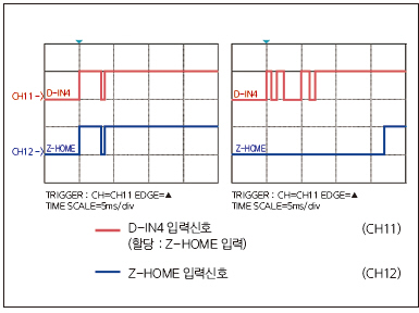 ▲ 그림 8. 채터링이 일어난 파형(左)과 ON신호 무효시간 10ms 설정 시의 파형