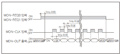 전원 투입 상태에서 I/O 위치 출력 기능을 사용하여 통신 기능이 없어도 현재 위치를 확인할 수 있다. I/O 위치 검출 기능이란, 검출 위치나 지령 위치, 알람 등의 정보를 I/O 신호로 상위 시스템에 전달하는 기능이다. 방법으로는 MON-REQ0 또는 MON-REQ1의 입력 후, MON-CLK 입력을 제어하는 것으로 MON-OUT 출력이 동작하여 정보를 얻을 수 있다(그림 12 참조).