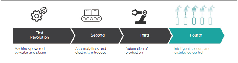 이제 ‘인더스트리 4.0’이라는 또 하나의 거대한 물결이 몰려오고 있다. 일반적으로 인더스트리 4.0은 공장에서 구현되는 인공지능, 빅데이터, 산업용 사물인터넷(IoT)을 의미한다. 물론, 공식적인 정의는 없지만 많은 이들이 인더스트리 4.0 이전 시대의 산업을 물과 증기의 힘을 사용한 산업(1.0), 전기, 모터, 기본적인 폐쇄 루프 제어를 사용한 산업(2.0), 산업 공정과 제어에 컴퓨팅 기능이 더해진 산업(3.0)으로 정의한다(그림 1 참고).