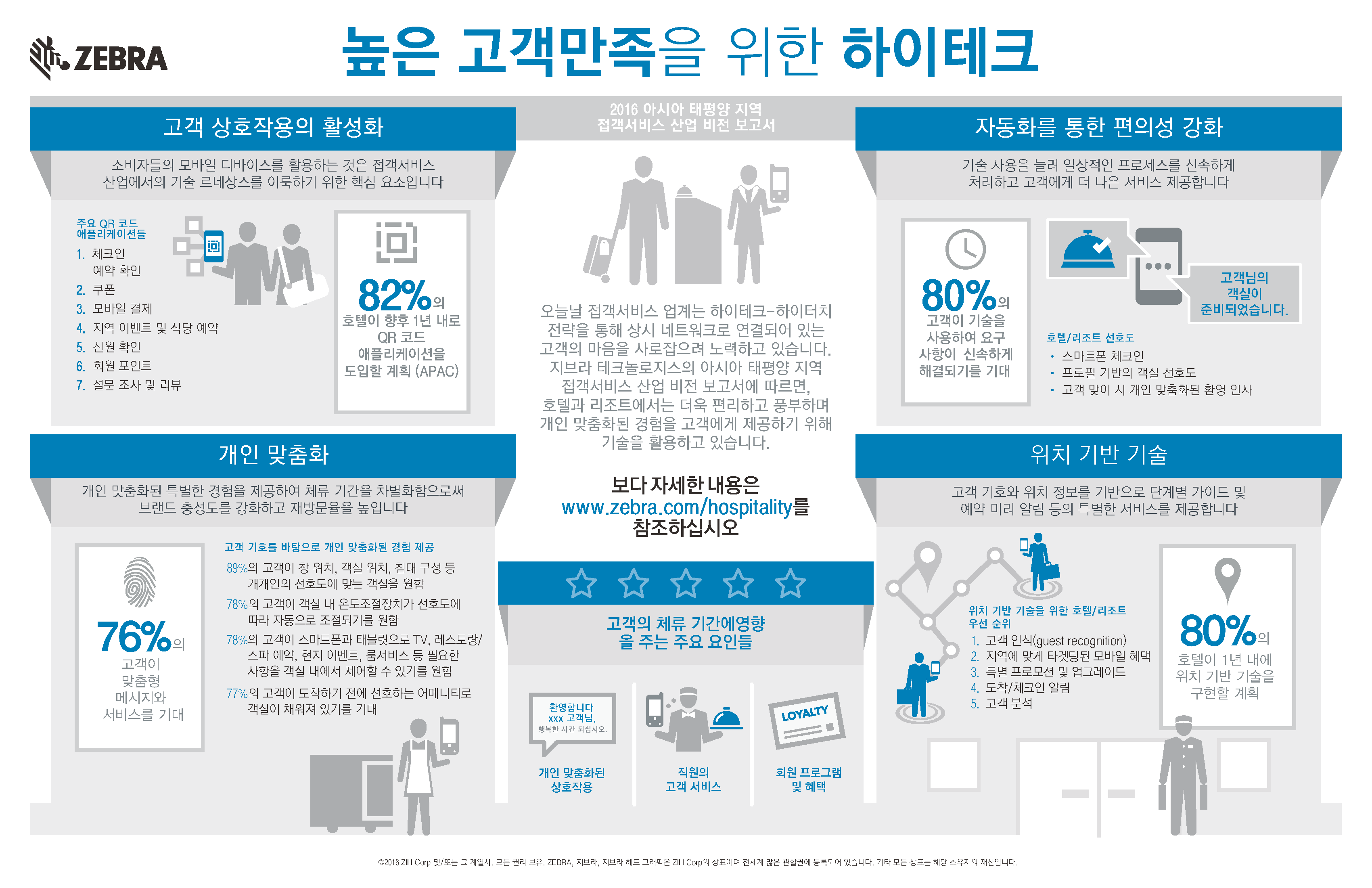 그는 또 “92%의 고객들이 스마트폰을 소유하고 있는 가운데, 이러한 기술 투자는 고객들이 스마트폰을 사용해 음식 주문에서부터 객실 준비 상태나 업그레이드 정보 등의 알림 메시지를 받는 것까지 가능하게 한다. 기술이 가져올 영향력은 시장에 따라 다양할 수 있지만, 디지털 지각변동이 모든 지역에서 호텔과 고객이 상호작용 하는 방식을 변화시키고 있음은 분명하다. 지브라는 더 나은 고객 서비스를 위한 고객 상호작용 및 직원 효율성 솔루션을 지속적으로 제공할 예정”이라고 밝혔다.
