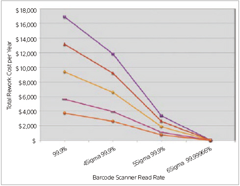 예상한 대로, 낮은 판독률로 처리량이 증가함에 따라 잠재적인 손실이 커진다. 예를 들어, 하루에 12만6,760개의 패키지를 처리하고, 평균 판독률이 99%인 대량 물류센터의 경우, 새로운 바코드 판독 시스템을 위해 10만 달러를 투자한다고 생각해 보자. 새로운 바코드 리더는 전반적인 판독률을 0.9%까지 향상시킬 수 있다.
