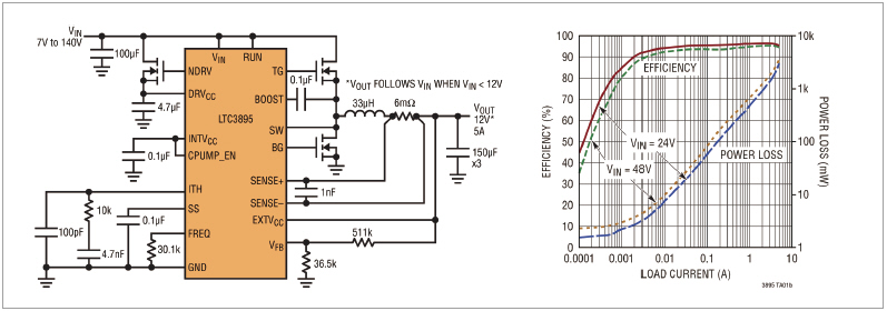 ▲ 그림 2. LTC3895 회로도, 효율 및 전력 손실 곡선