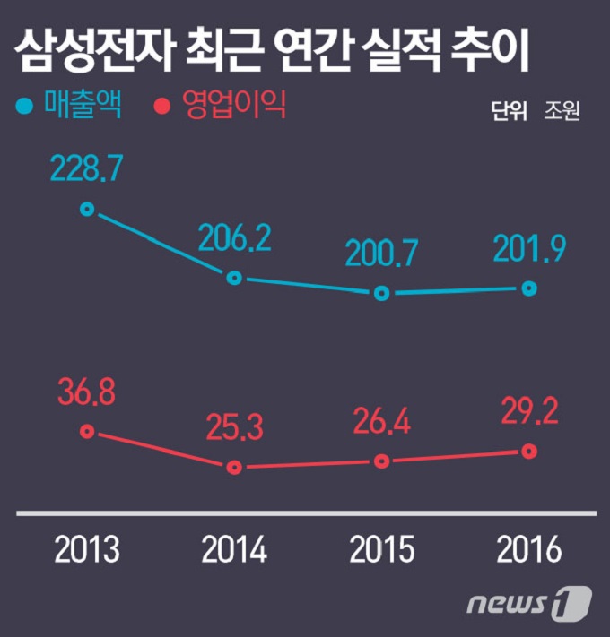 삼성전자는 24일 지난해 4분기 영업이익이 9조2000억원을 기록해 2013년 3분기(10조1600억원) 이후 사상 최대 규모를 기록했다고 밝혔다. 역대 순위로는 2013년 2분기 9조5300억원에 이어 3위에 해당하는 실적이다. 지난해 연간 영업이익은 29조2400억원으르 기록했으며 이 가운데 반도체 영업이익이 13조6000억원으로 절반에 육박했다.