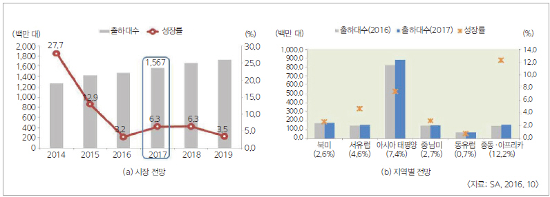 올 한해 스마트폰 시장은 15억 7천만 대(6.3% 증가)로 전년대비 소폭 성장에 그칠 것으로 전망되고 있다. 특히 중동·아프리카(12.2%)를 제외한 북미(2.6%)와 서유럽(4.6%)은 통신사 보조금이 축소되고, 아시아·태평양(7.5%)과 중남미(2.7%) 등은 신규 가입자가 감소함에 따라 한 자릿수 성장에 그칠 것으로 예측되고 있다.