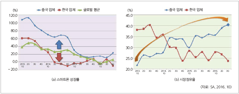 중국 업체의 스마트폰 출하는 글로벌 시장이 전반적으로 정체되어 있음에도 불구하고 두 자릿수 성장세를 유지하고 있으며, 그 결과 스마트폰 시장 점유율은 2016년 3분기에 40%를 돌파하는 모습을 보였다. 이는 프리미엄 제품에 버금가는 성능이나 디자인을 구현하면서도 가격은 절반에 가까운 제품들을 앞세워 글로벌 시장 장악력을 확대한 덕분이라고 할 수 있다. 특히 화웨이(7.5% → 9.0%), 오포(2.5% → 5.8%), 비보(2.8% → 4.9%)의 글로벌 시장 점유율은 전년 동기대비 상승했지만, 삼성전자(23.7% → 20.1%), 애플(13.6% → 12.1%)은 하락세를 나타냈다.
