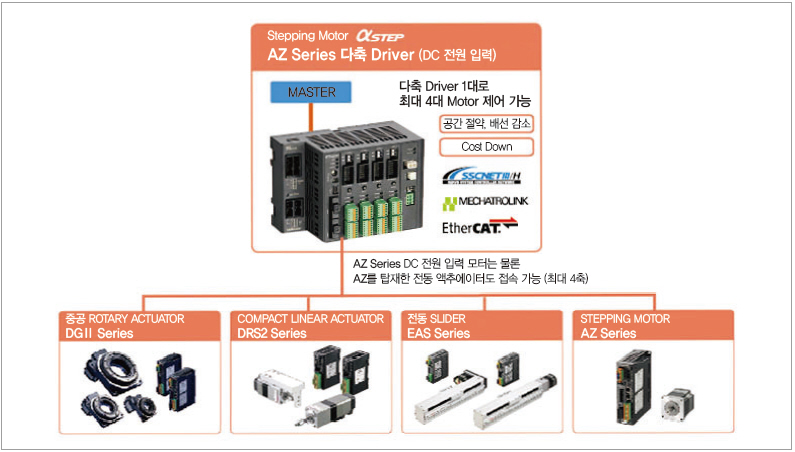 AZ 시리즈는 다축 드라이버를 갖추고 있다. 이는 DC 전원 입력의 모터는 물론 AZ 모터를 탑재한 전동 액추에이터로도 접속이 가능하다.