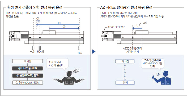 ABZO 센서부에서 절대 좌표를 가지고 있어 원점 복귀 운전을 할 필요가 없다. 굳이 원점 복귀 운전을 할 경우에도 모터가 원점 위치를 알고 있기 때문에 외부 센서는 필요하지 않다.